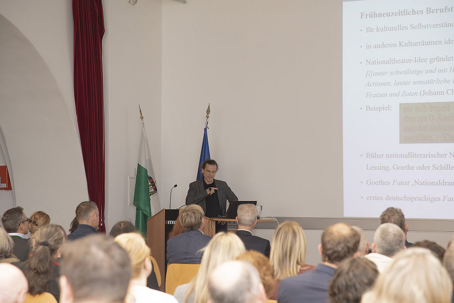 Nach dem Mittagsempfang auf Einladung von Landeshauptmann Mario Kunasek referierte Priv.-Doz. Mag. DDr. Peter Wiesflecker in Vertretung von Frau Mag. Margarethe Lasinger über die Neupositionierung des Archivs der Salzburger Festspiele, das als Archiv der Artefakte neue, erfolgreiche Wege der Vermittlung von theaterbezogenen Archivalien geht. Frau Dr. Ilse Fink stellte in ihrem Vortrag das Österreichische Kabarettarchiv mit Sitz in Graz vor, welches als außergewöhnliches Spezialarchiv einen wertvollen Beitrag zur Bewahrung und Dokumentation des österreichischen Kabaretts leistet. Am Ende des Vortragsreigens stand eine Vorstellung der „Öblarner Festspiele" durch Frau Ilse Rietzinger und Frau Claudia Gassner am Programm. Sie gaben einen praxisorientierten Einblick in das größte Laientheater im Alpenraum, wo alle fünf Jahre rund 300 Bürgerinnen und Bürger das Stück „Die Hochzeit" von Paula Grogger, welches den Besuch von Erzherzog Johann im Jahre 1821 zum Inhalt hat, in der Marktgemeinde Öblarn aufführen.