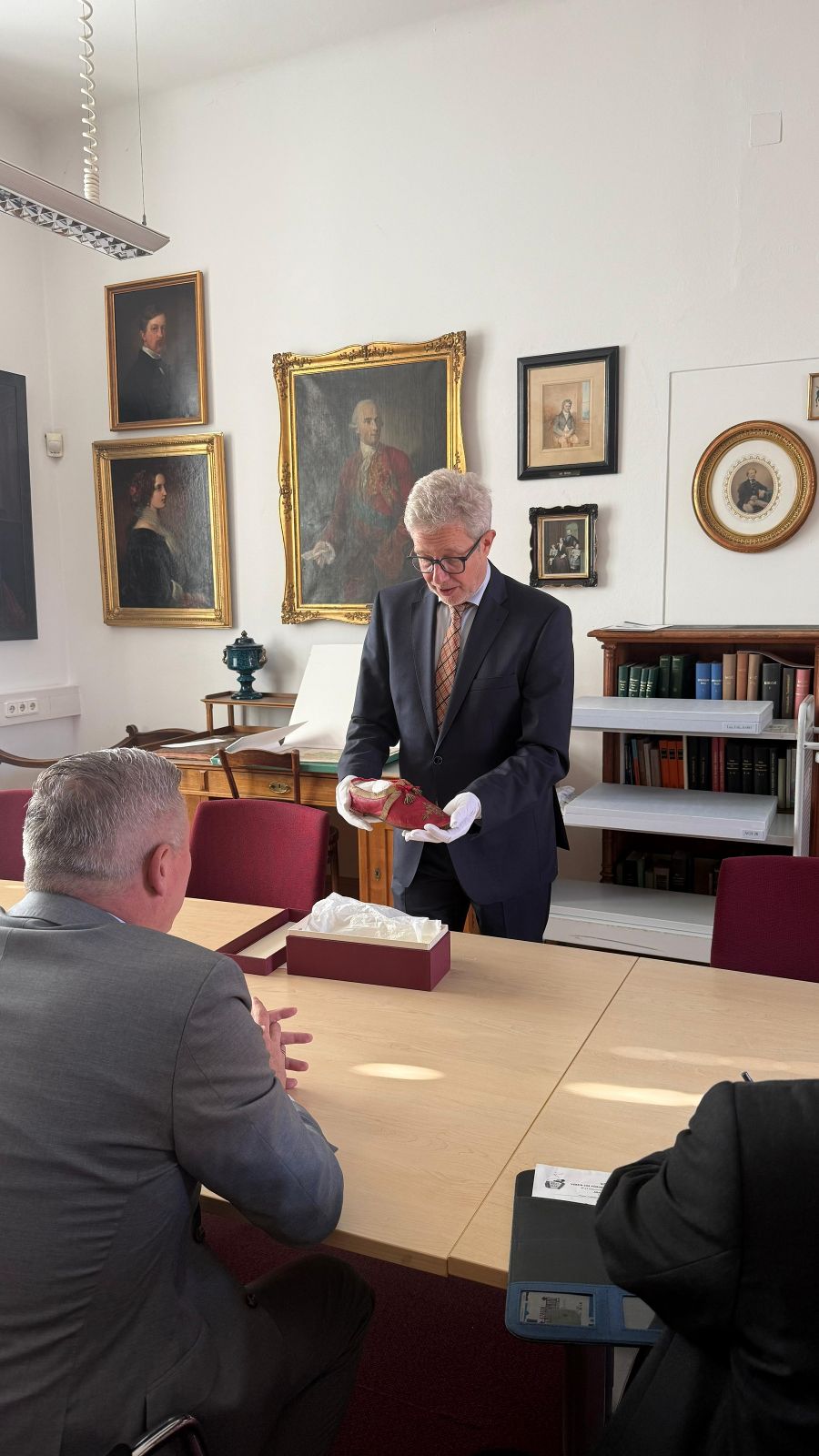 Landeshauptmann Mario Kunasek besuchte als Ressortverantwortlicher am 10. November 2025 das Steiermärkische Landesarchiv. Landesarchivdirektor Hofrat Dr. Gernot Peter Obersteiner, begleitet von Abteilungsleiter Mag. Florian Tunner (A3), führte durchs Haus und präsentierte dem Landeshauptmann einige "Highlights" wie die "Georgenberger Handfeste" aus dem Jahr 1186, die älteste steirische Verfassungsurkunde und zugleich auch den ältesten österreichischen Staatsvertrag, den aus rotem Ziegenleder gefertigten Pontifikalschuh von Papst Pius IX. aus der Mitte des 19. Jahrhunderts sowie historische Landkarten der Steiermark. Neben der Besichtigung aller Öffentlichkeitsräume wie Wartingersaal, Wissenschaftliche Beratung und Lesesaal wurde auch ein Blick in die Depots geworfen, wo das rund 63.000 Laufmeter umfassende Archivgut bestens geschützt und gelagert sowohl für die heutige Forschung als auch für die kommenden Generationen aufbewahrt wird. Im Anschluss nahm sich der Landeshauptmann noch Zeit für einen Besuch der hauseigenen Restaurierungswerkstätte, der Handbuchbinderei sowie des Reprostudios und ließ es sich auch nicht nehmen, mit Mitarbeiterinnen und Mitarbeitern das persönliche Gespräch zu suchen. Zum Abschluss des Besuchs wurde dem Landeshauptmann von Archivdirektor Obersteiner noch das brandaktuelle Jahrbuch des Landesarchivs mit seinen vielen spannenden Berichten und Beiträgen überreicht.